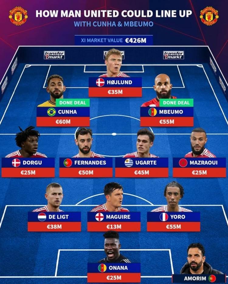 直播吧7月22日讯 曼联已经连续官宣库尼亚和姆贝莫,《转会市场》也预测了红魔新赛季的主力阵容。德转预测曼联新赛季主力阵:总身价4.26亿欧元前锋:库尼亚(6000万)、霍伊伦(3500万)、姆贝莫(5500万)中场:多古(2500万)、B费(5000万)、乌加特(4500万)、马兹拉维(2500万)后卫:德里赫特(3800万)、马奎尔(1300万)、约罗(5500万)门将:奥纳纳(2500万)