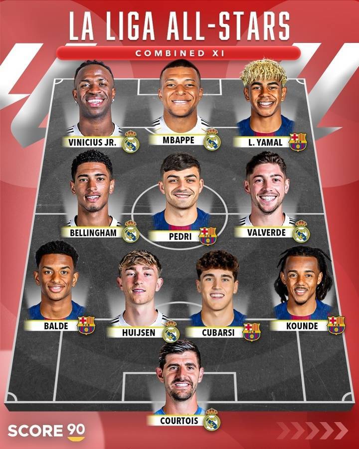 直播吧08月16日讯 外媒SCORE90列出西甲、英超全明星阵容,并抛出提问:西甲联赛对阵英超全明星,谁将获胜?西甲全明星:门将:库尔图瓦后卫:巴尔德、怀森、库巴西、孔德中场:贝林厄姆、佩德里、巴尔韦德前锋:维尼修斯、姆巴佩、亚马尔英超全明星:门将:阿利森后卫:格瓦迪奥尔、范迪克、萨利巴、廷伯中场:帕尔默、罗德里、赖斯前锋:萨卡、哈兰德、萨拉赫