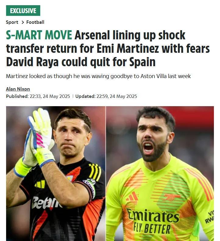 太阳报独家消息,如果拉亚今夏转会前往西班牙,阿森纳希望签回达米安-马丁内斯(大马丁)。报道称,阿森纳正在考虑签回大马丁,这位阿根廷门将此前曾在枪手效力多年。拉亚已经被皇马视为引援候选。此外由于奥布拉克可能前往沙特,马竞也在关注拉亚。尽管拉亚表现出色,但如果价格合适,阿森纳还是愿意出售球员,枪手也知道大马丁转会具有可行性,但他们必须尽快行动,因为中东球队也对球员感兴趣。